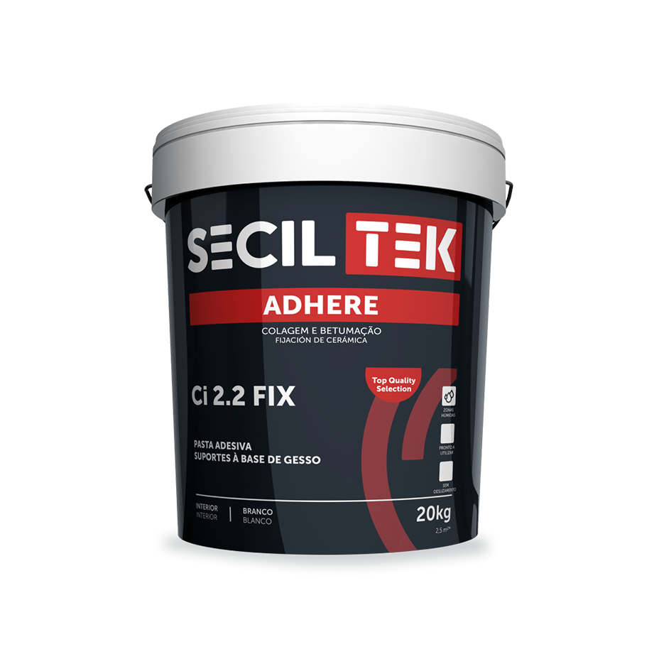 La pasta adhesiva ADHERE Ci 2.2 FIX es un adhesivo de construcción listo para aplicar, con tiempo abierto prolongado y menor deslizamiento (clasificación D2 E según NP EN 12004-1), formulado a partir de resinas sintéticas en dispersión acuosa, inertes y aditivos orgánicos y/o inorgánicos específicos.